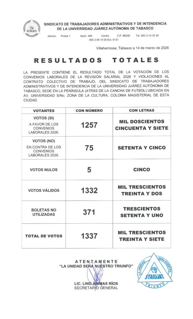 Resultados Totales de la Votación sobre los Convenios Laborales de la Revisión Salarial 2026 y las Violaciones al Contrato Colectivo
